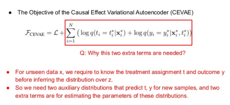 We know that VAE only encode X to z, then z decode to output. In our case, our guide need addition y,t to compute z. That’s why the authors said we need to predict those two.