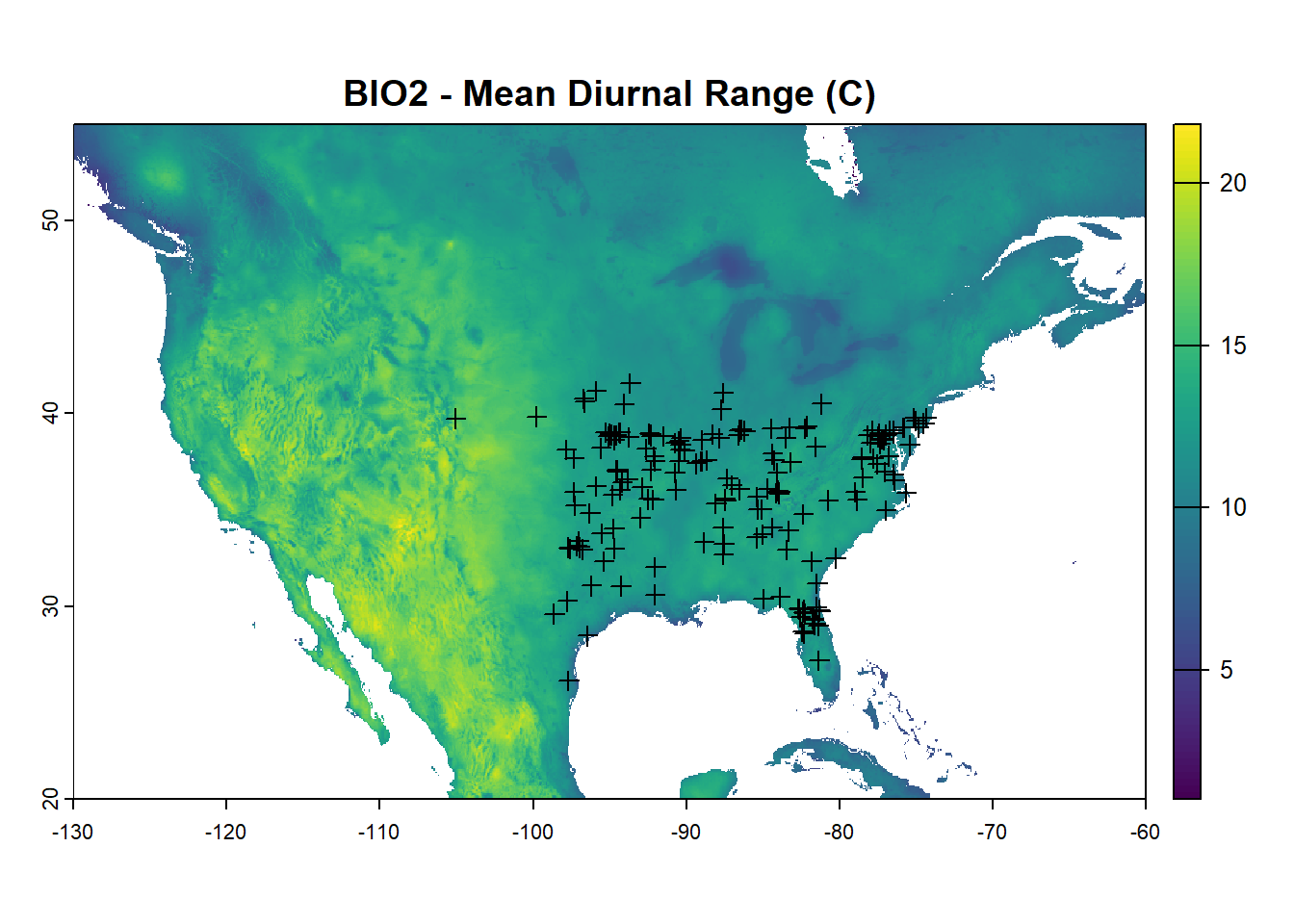 You can also bring in worldclim data for projections in the future under different RCP scenarios, e.g. 2070 under RCP 4.5 or. Or, manually add a fixed value such as 2 degrees C to the entire raster (including your own). Note that this was updated on Feb 16th, 2025 since the package/function changed since I first designed this exercise.