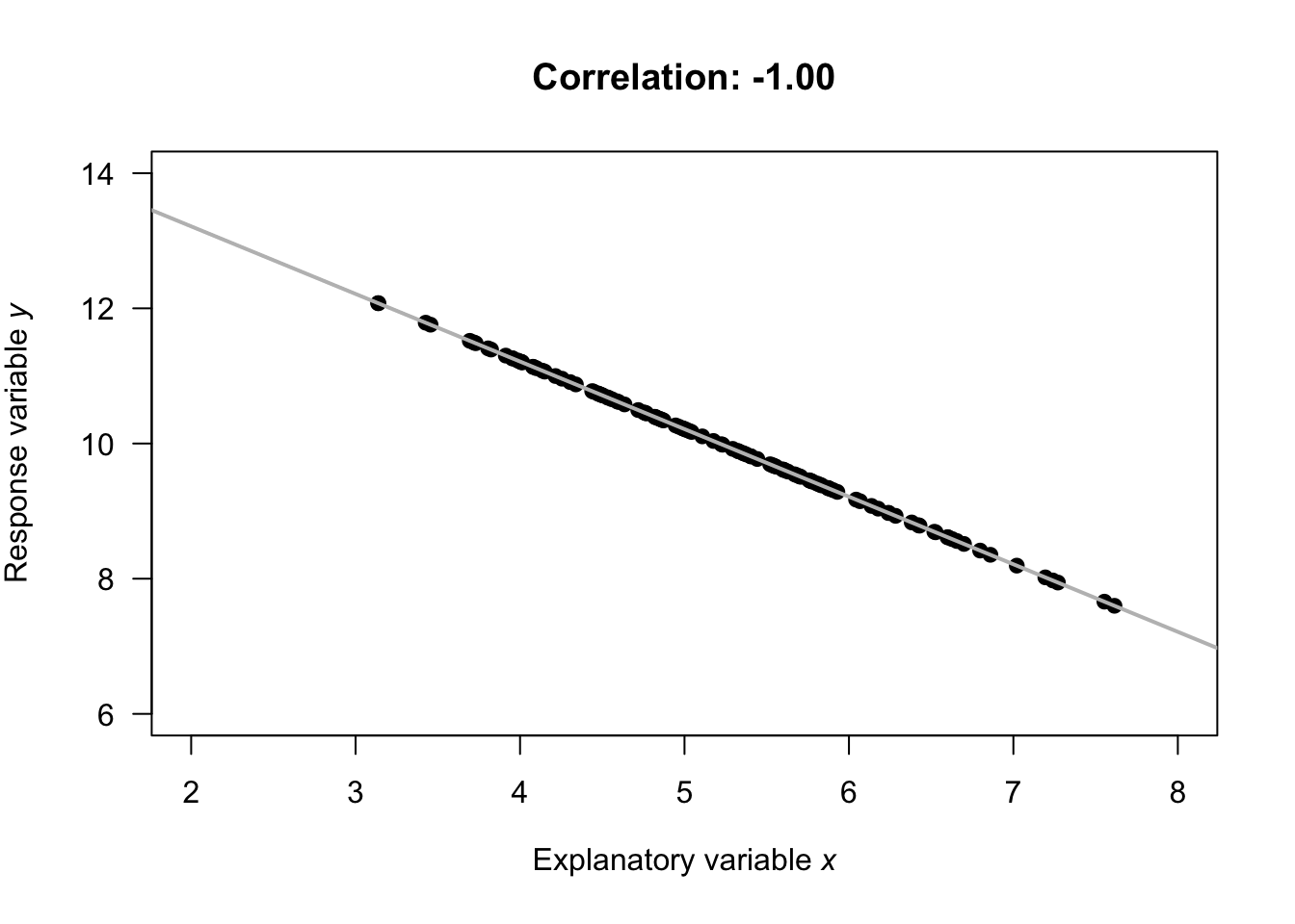 - \(r=-1\) means a perfect, negative relationship: knowing the value of \(x\) means we can perfectly predict the value of \(y\) (and larger values of \(y\) are associated with smaller values of \(x\), in general).