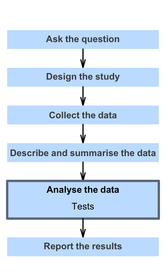 So far, you have learnt to ask a RQ, identify different ways of obtaining data, design the study, collect the data describe the data, summarise data graphically and numerically, understand the tools of inference, and to form confidence intervals.