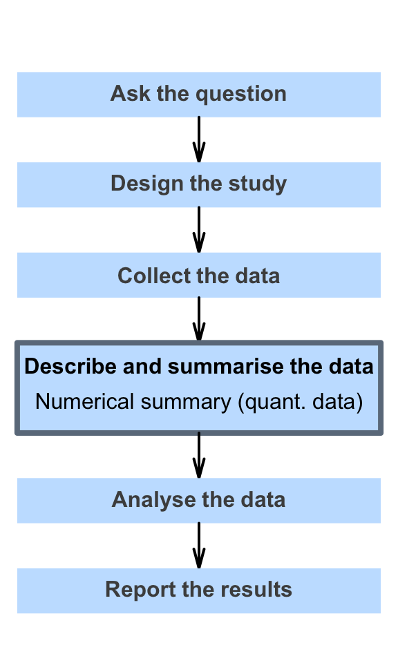 So far, you have learnt to ask a RQ, identify different ways of obtaining data, design the study, collect the data describe the data, and graphically summarise data.