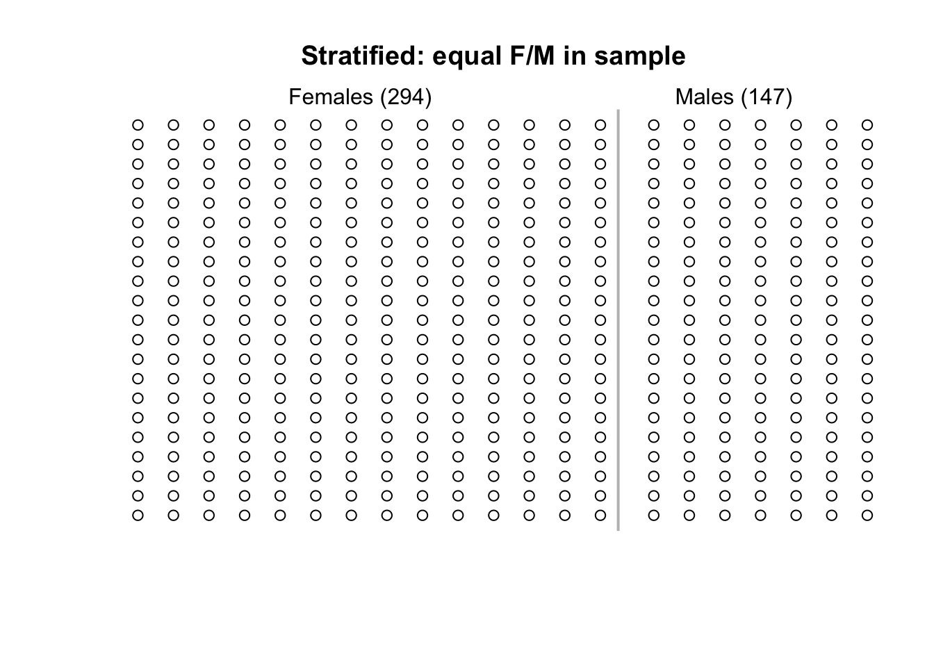 Similarly, the second animation below shows how a stratified random sample of size 40 might be selected, by randomly selecting 27 female and 13 male students.