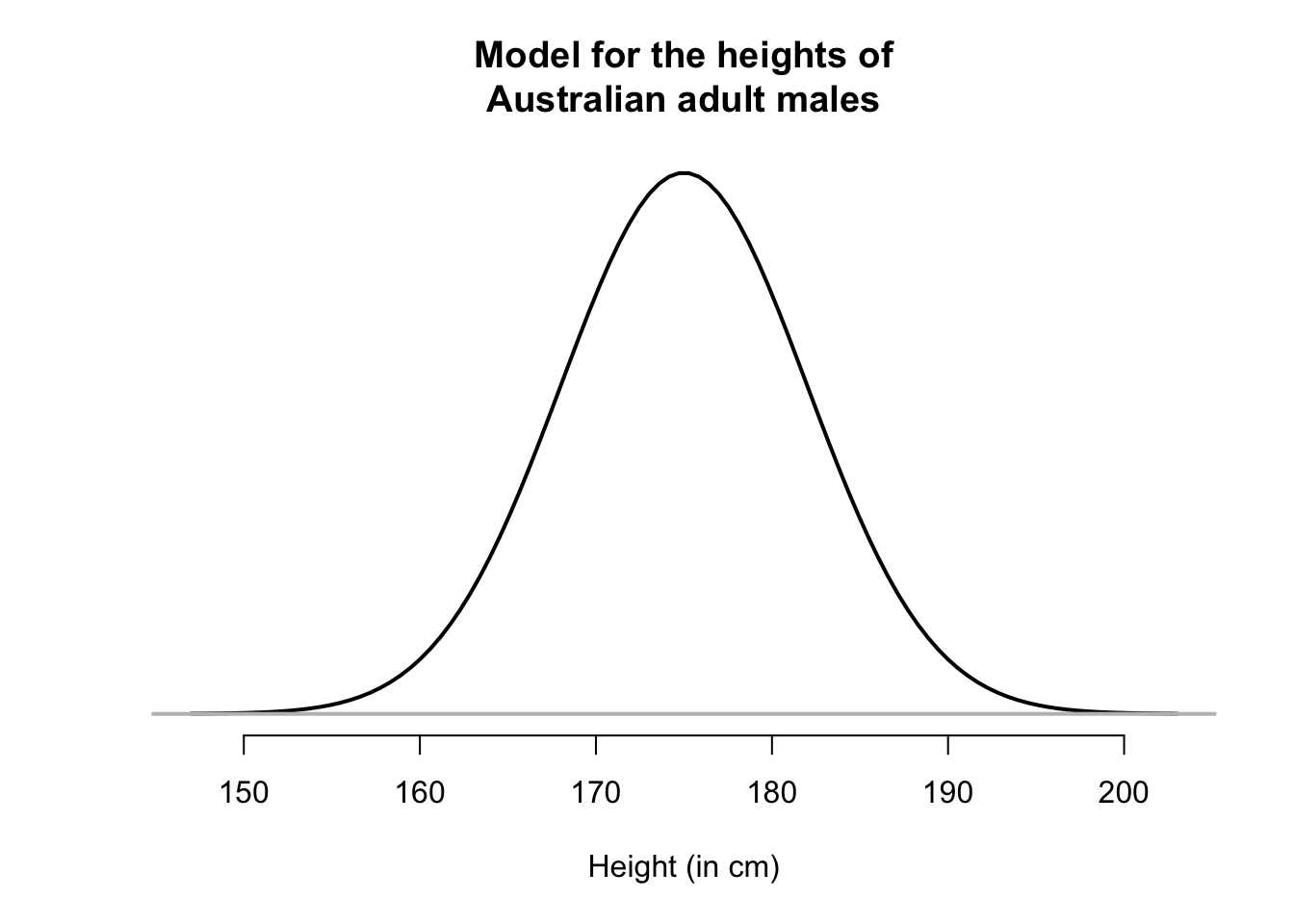 A model could be assumed for the heights of all Australian adult males. This is a theoretical idea that might be a useful description of the heights of Australian adult males in the population. Suppose a model for the heights of Australian adult males is adopted that has: