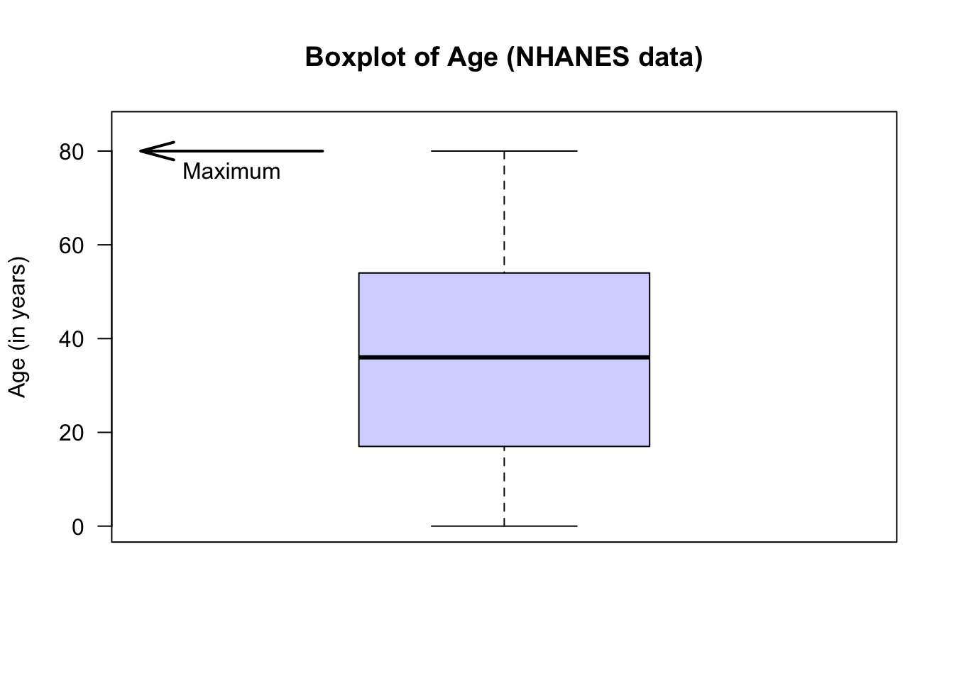 The animation below shows how the boxplot of the age of the Americans in the sample is constructed. The “average” age of the subjects is about 38 years, and the ages range from almost zero to about 80 years of age.