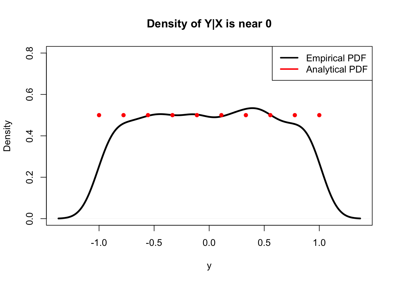 legend("topright", legend = c("Empirical PDF", "Analytical PDF"),