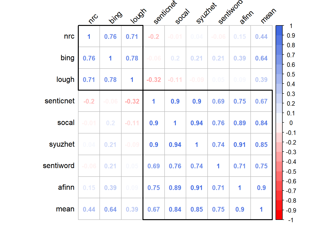 Figure 4.9 shows just the “binary” lexica (Bing, Loughran and NRC). We can see these are highly correlated.