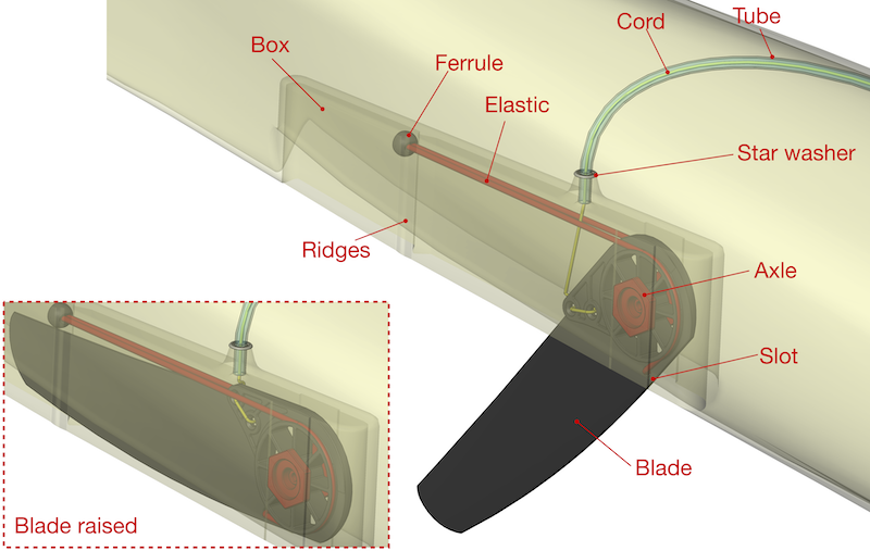 The actuator subsystem. Within the skeg box, the blade is pulled down by elastic and raised by the cord.