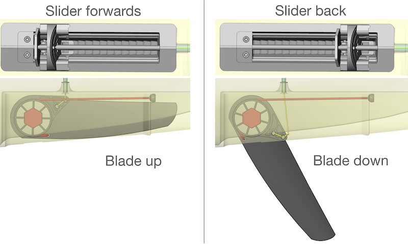 When the slider is set to the forward position, the cord is pulled through the tube and the blade is pulled fully up