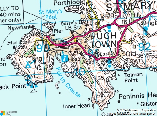 Paddling out of Portloo, turn left around a rocky area (island at HW). Pass a small beach, a rocky promontory, a second beach and a lifeboat station. Paddle past the town beach and round the pier. Pass a small island, turning left. Pass a point and turn left again. Left again at a point with a beacon offshore. Sharp left inside some islands into a beach with buildings behind. Back out of this bay, past an indent (island) to a major headland (lighthouse). Round the headland, offshore island, smaller headland and into Old town bay (look for main road and the town).