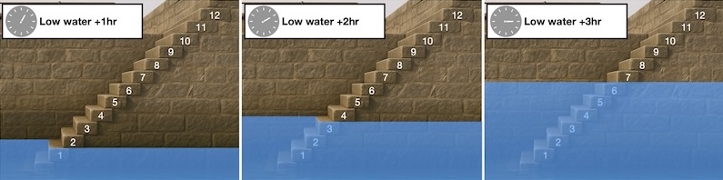Low water today is at 12:00, and at low water, the water level is at the bottom of the first step. It just so happens that high water today will be at the top of step 12, 3.6 m higher. So, a twelfth of the tidal range is 3.6 m/12 = 0.3m = 30 cm = the height of one step.