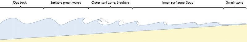Once they reach the ‘inner surf zone’ or, colloquially, the ‘soup’ the waves no longer have a defined face. What’s left are piles of broken whitewater rolling in towards the beach. In big surf, it can require some power to punch through these waves. Kayaks positioned side on to these broken waves will get pushed sideways into the beach.