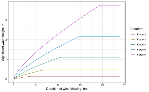As we’d expect, as the wind blows for longer, the waves get higher. But for any wind speed, a limit is reached when the waves stop growing. This is known as a ‘fully developed sea’. The time taken to get to this stage depends on how strong the wind is blowing.
