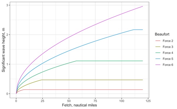 The fetch can have a big effect on the waves that we experience. The plot below shows roughly how wave height varies with wind speed and fetch: