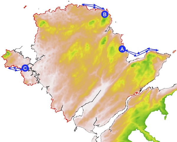 We’ll likely want to shelter from a force 5 wind. Being on a coast open to the south-west, paddle C will be exposed to the wind. The low-lying valley across the island means that there will likely be little shelter for paddle A. Paddle B makes the most sense. It is sheltered by some higher ground and some sea cliffs. It begins by paddling against any westerly component of the wind blowing along the coast.