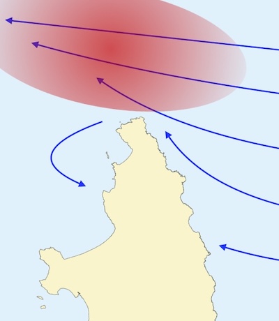 Most people will be aware that land features can affect the local wind around them - on a windy day, you can often find shelter behind a crag facing away from the wind. In fact, the land has a marked effect on the wind, often affecting wind patterns 10 miles or more out to sea. The effects of land features on the wind are going to be important for sea kayakers who mostly spend their time near the coast.