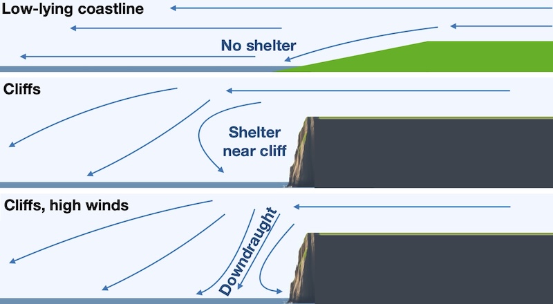 The amount of shelter that the land provides depends on the topography. Flat land without vegetation will provide little shelter. Tall cliffs are likely to provide excellent shelter from the wind - but beware downdrafts in very windy conditions. Any steep coastline, even if cliffs are only a few meters high, can provide useful shelter if a group stays close in under the cliffs. Some coastlines that provide good shelter can have areas where the wind blows strongly off the land. This can occur at gaps in cliff lines and where valleys that run parallel to the wind run down to the sea.