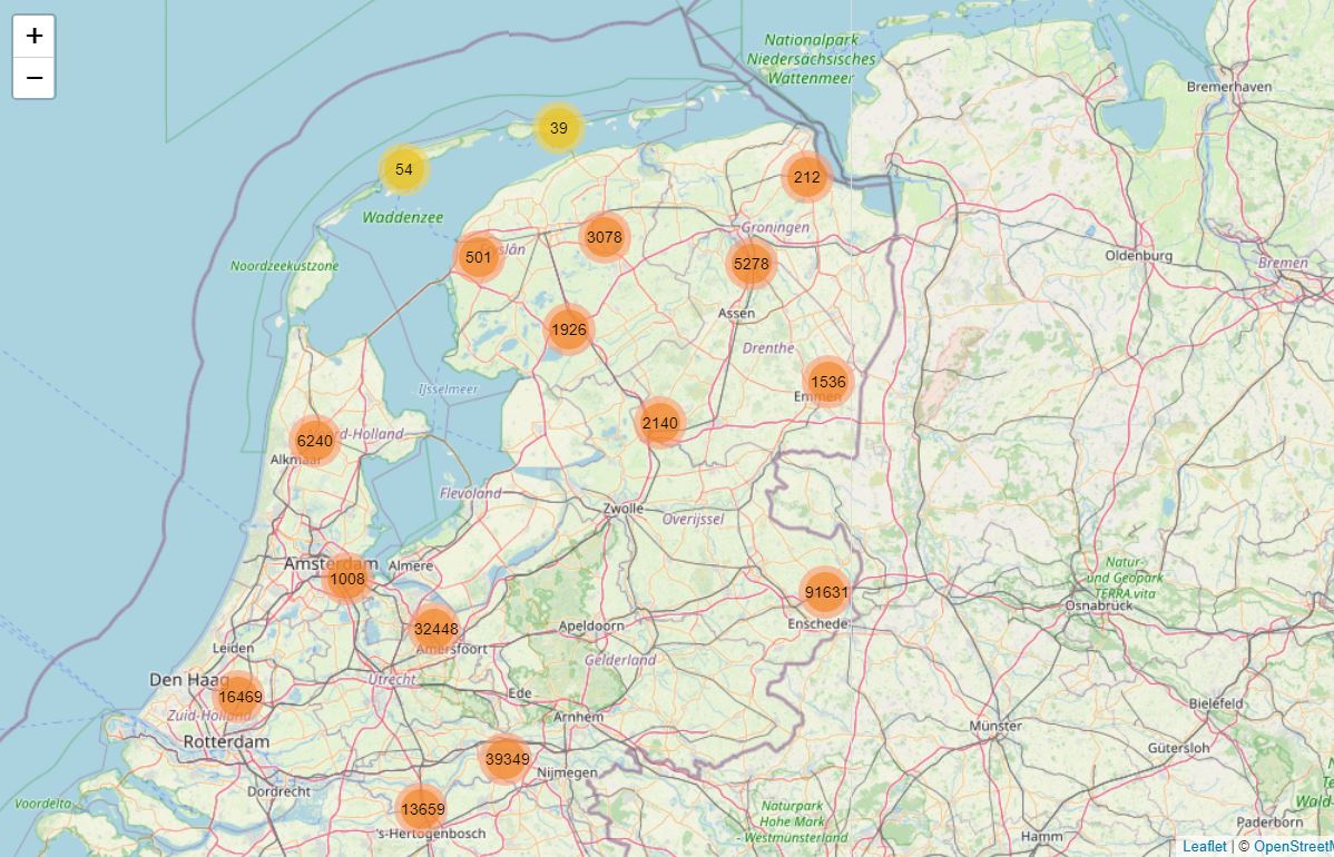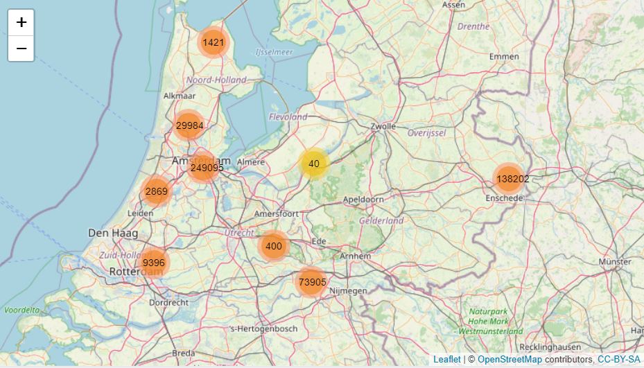 # leaflet(fl_from_r1) %>% addTiles() %>% addMarkers(clusterOptions = markerClusterOptions())If you run the script, you will get a map. Click on the map, and see what happens if you zoom in and out. In your script, of course you have to leave out the #’s that precede the commands!