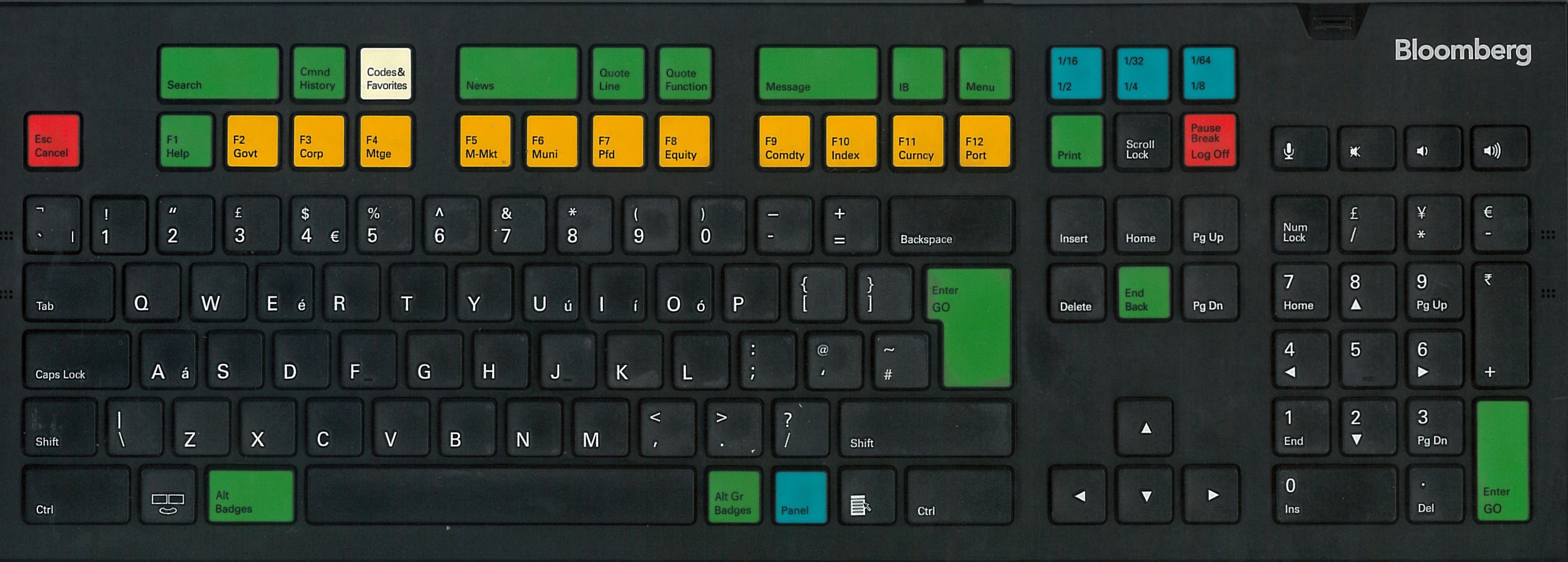 Green keys are the action keys such as help, go, forward and backwards. Blue is the panel key that allows you to switch between the four windows that are the Bloomberg default. Red keys allow you to log off.