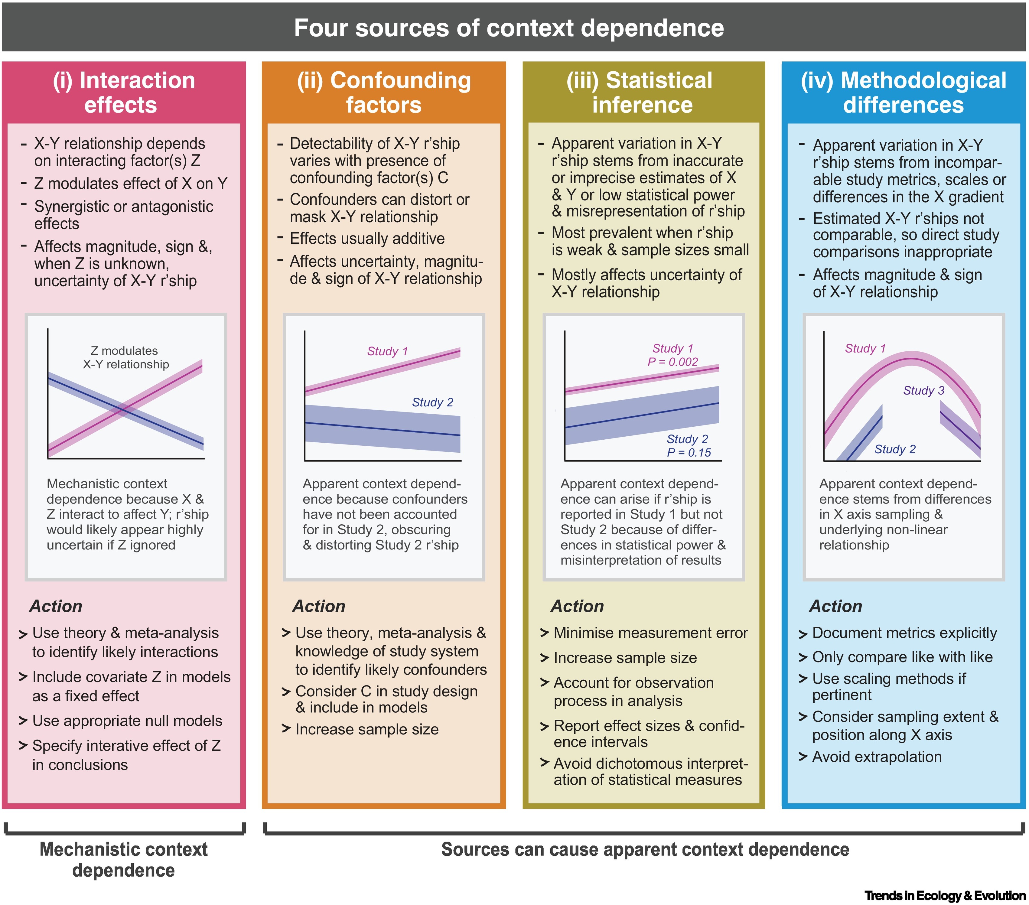 The figure shows the relationship between independent variable X and dependent variable Y, with illustrative examples and actions that can reduce unexplained variation and the likelihood of apparent context dependence. ‘Mechanistic context dependence’ (Figure 5.2i) is caused by interaction effects and reflects an underlying ecological process that drives differences between observed relationships. In contrast, ‘apparent context dependence’ (Figure 5.2ii-iv) occurs when the relationship between two variables appears to differ, but in reality does not. A very common type of apparent context dependence is ‘methodological context dependence’ (Figure 5.2iv), where varying methods used by different studies cause observed patterns to differ between them. Scale dependence is a form of apparent context dependence, caused by methodological differences when studies use different grains or extents. Other sources of apparent context dependence include confounding factors and statistical inference.