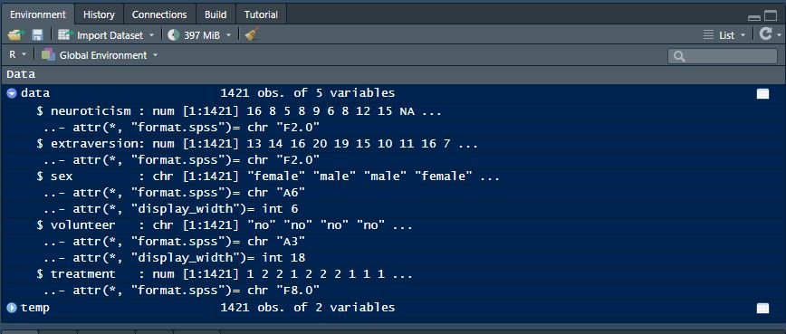 We can also see this for the first variables in the dataframe by clicking the arrow next to our dataframe in the environment.
