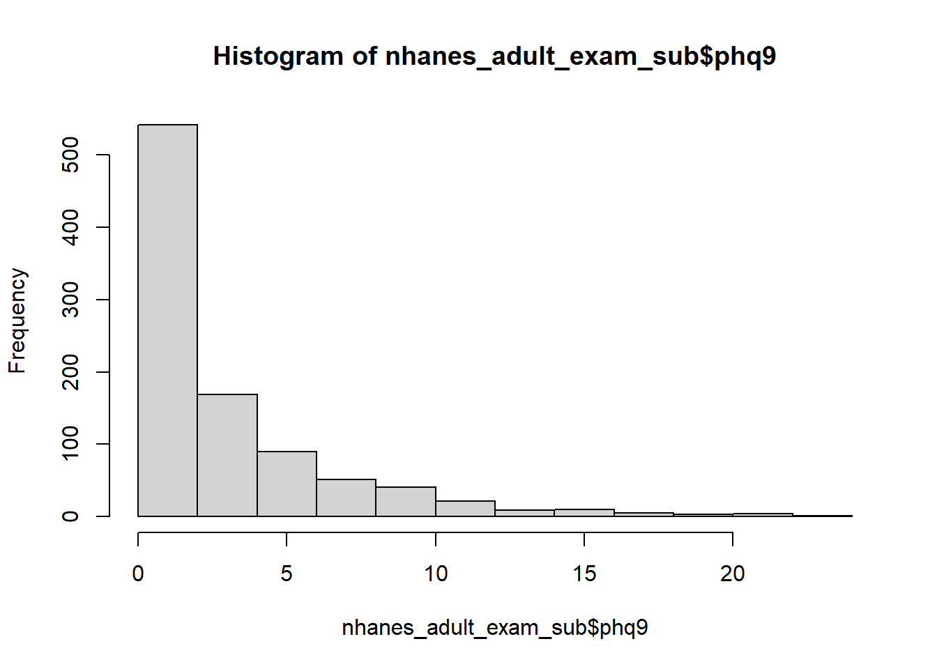 Example 6.5: The PHQ-9 is the depression module of the Patient Health Questionnaire (Kroenke, Spitzer, and Williams 2001; Kroenke and Spitzer 2002). It consists of nine questions, each scored from 0 to three and summed for a total score ranging from 0 to 27. Scores in the ranges 0-4, 5-9, 10-14, 15-19, and 20-27 are labeled as Minimal, Mild, Moderate, Moderately Severe, and Severe depression, respectively. A summary and histogram of PHQ-9 scores (phq9) from the NHANES examination teaching dataset (nhanes1718_adult_exam_sub_rmph.Rdata) reveals that it has many zeros and is highly skewed. Create a three-level ordinal variable corresponding to Minimal, Mild, and Moderate to Severe depression.