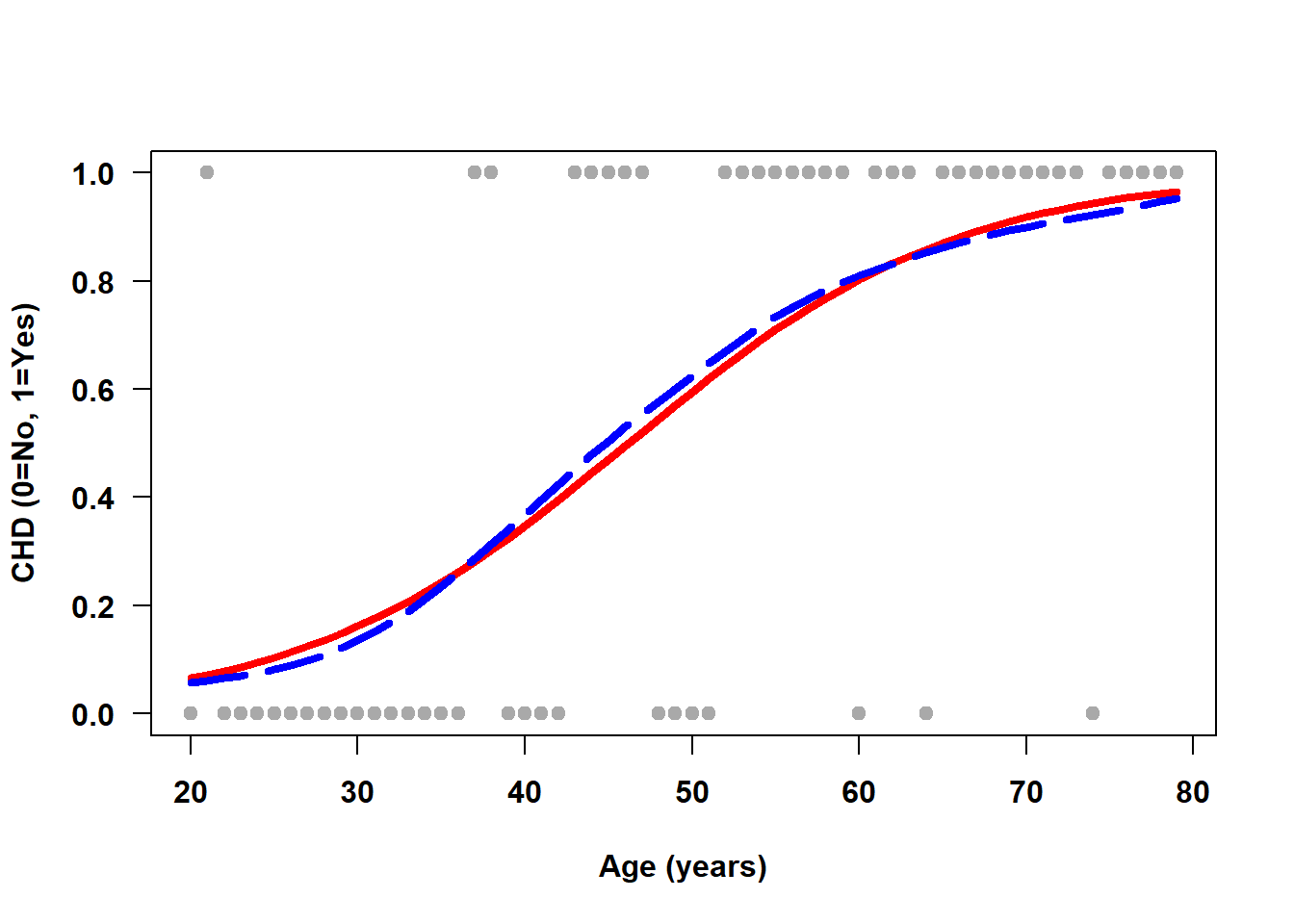 Example 6.1: Figure 6.1 displays the linear regression fit for simulated data from 60 individuals aged 20 to 80 years where \(Y\) = coronary heart disease (CHD) status and \(X\) = age. The possible values for \(Y\) are “yes” and “no” coded as \(Y = 1\) and \(0\), respectively. The gray dots at \(Y = 1\) (along the top of the figure) are plotted at the ages of individuals with CHD, while the dots at \(Y = 0\) (along the bottom of the figure) are for those without CHD. The solid line is the linear regression line, which attempts to estimate the proportion of CHD = Yes (the mean outcome) as a function of age using a straight line. The dashed line is a smoother which tracks the observed proportion without any constraint on its shape.