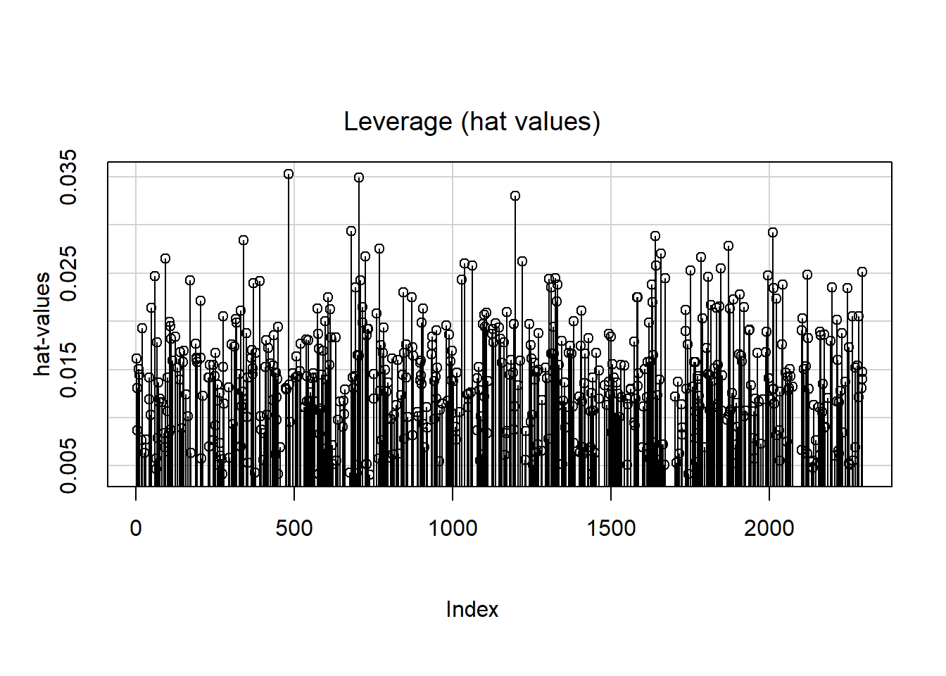 - The hat value measures how far an observation’s predictors, taken together, are from those of other observations. Observations with large hat values have high leverage and are potentially (but not necessarily) influential. There is no objective cutoff above which a hat value is considered “large”. Instead, look for observations with hat values that are much larger than those of the other observations.