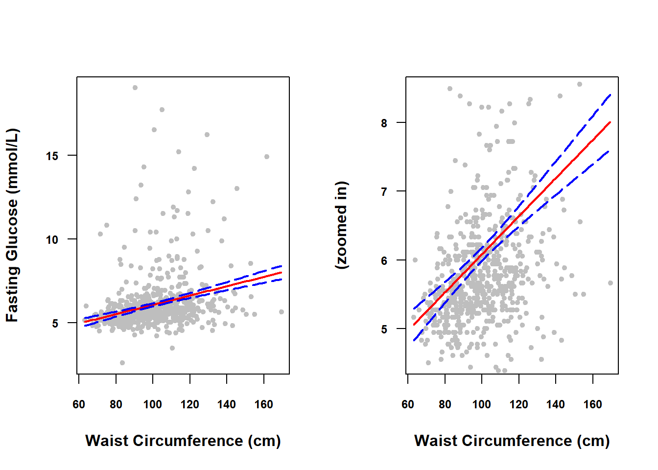plot(LBDGLUSI ~ BMXWAIST, data = nhanesf,
