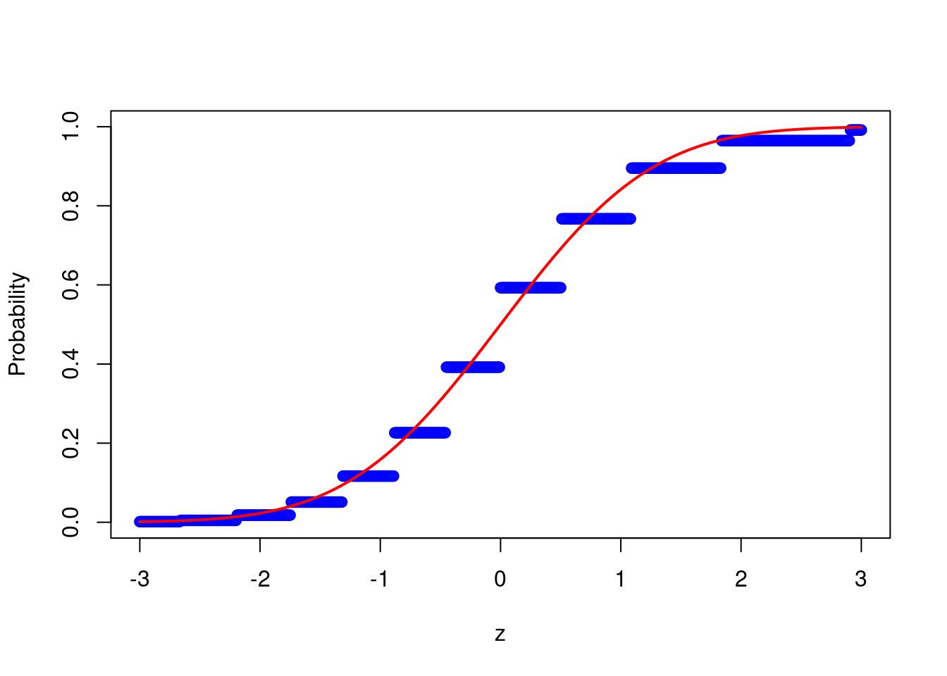 plot(z,probs,ylim = c(0,1),xlab="z",ylab="Probability", col = 'blue')