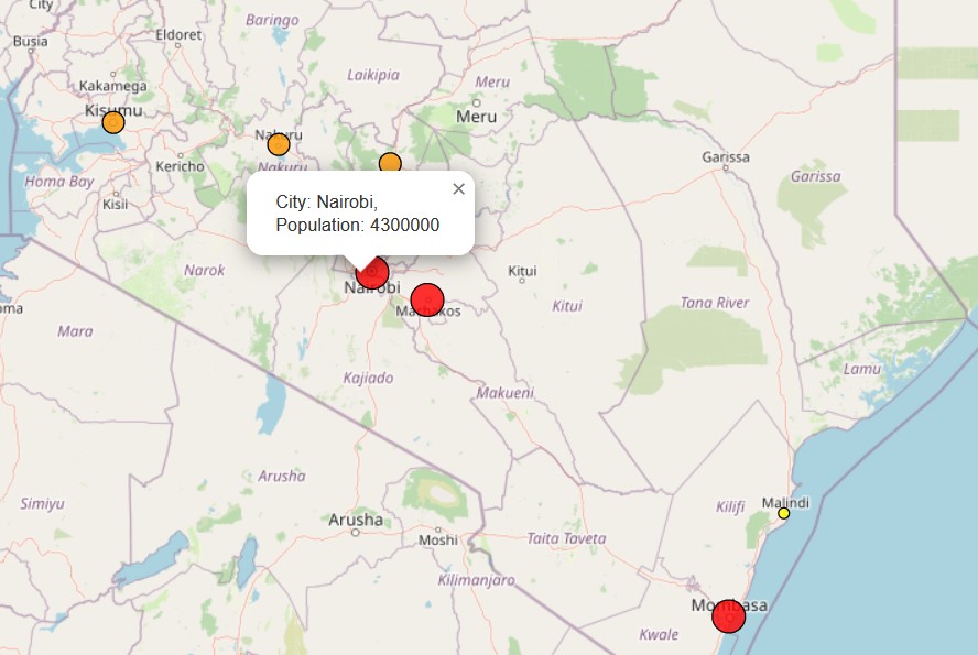 What you get is a map where the size of the circle markers has been defined by the city’s population. This time round, the pointToLayer() function body worked with if/else if statement to differentiate the radius and color of each circle marker. Under the if/else if code statement block, different circle marker specifications of radius and fillColor were inserted for each population category. Any city with a population beyond 800000 was fitted into the else block.