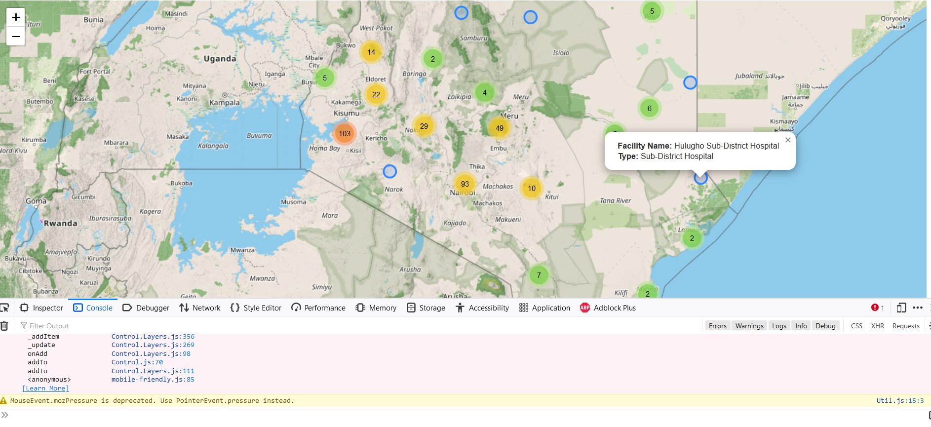 Before you head on any further, inserting the overlays object into the L.control.layers() class results in several errors. This is why we were unable to create a control for the markers held in var cluster. The image below shows the errors appearing in the console after inserting the overlays object into L.control.layers().
