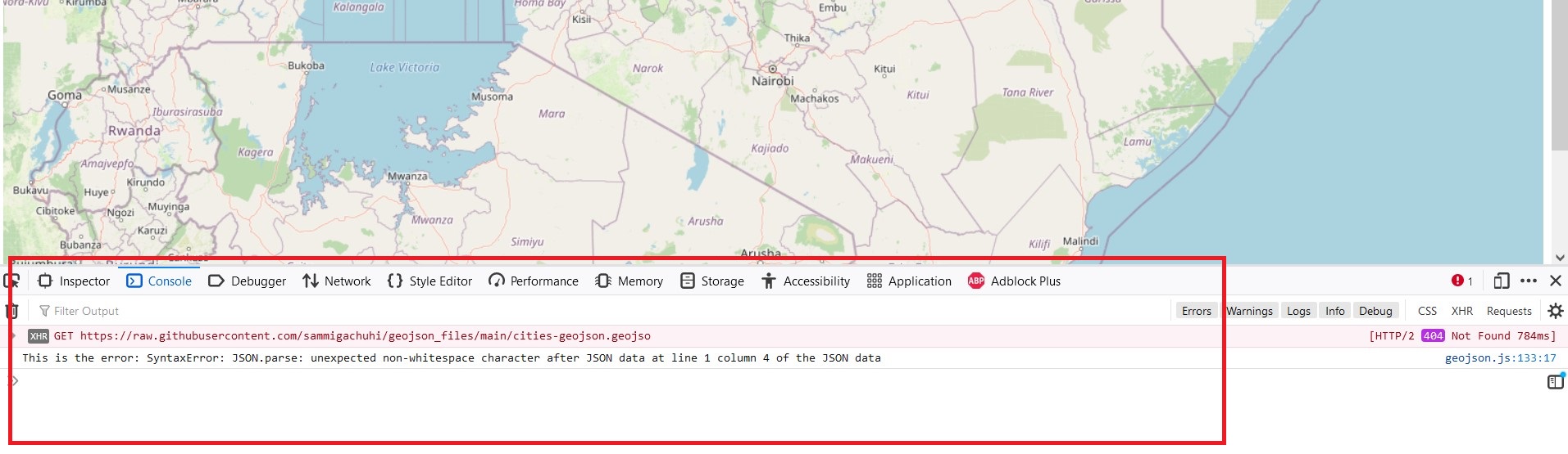 To see the catch() in action, omit the last letter in our url so that it reads cities-geojson.geojso. Yeah, you read it right. Just omit the letter ‘n’ for now and reload your map.html. Right click the webmap page and click on Inspect in the small interface that appears. Head over to the console tab and see the error response. It should read like in the below image.
