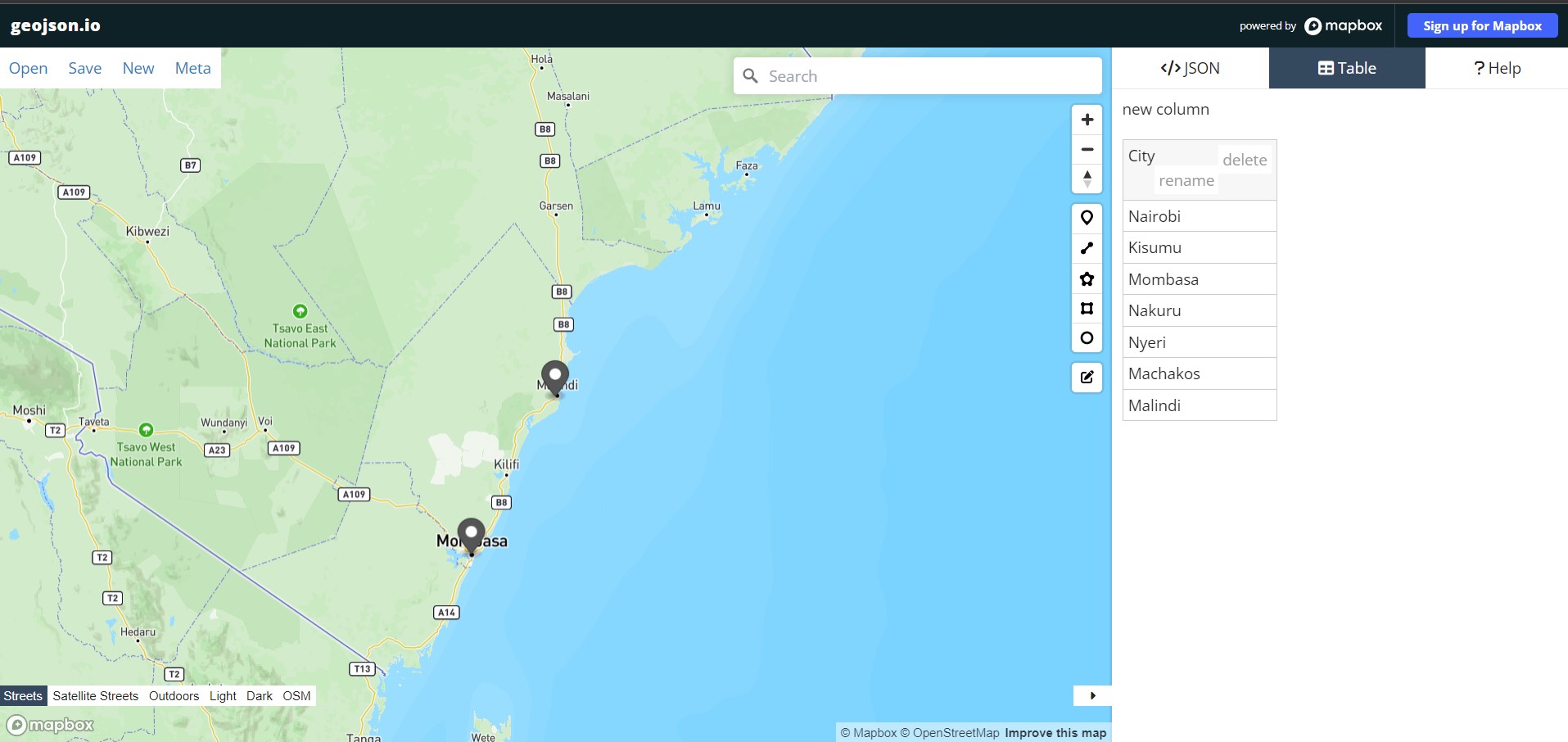 Now create a new pin over Kisumu and two things will happen: a new dictionary will appear below that of Nairobi and a new table row will appear in the Table tab. Create pins over the following cities: Mombasa, Nakuru, Nyeri, Machakos and Malindi. Legally speaking, only the first four are cities by law, the rest are just towns but for the sake of this tutorial, let’s corporately refer to them as cities.