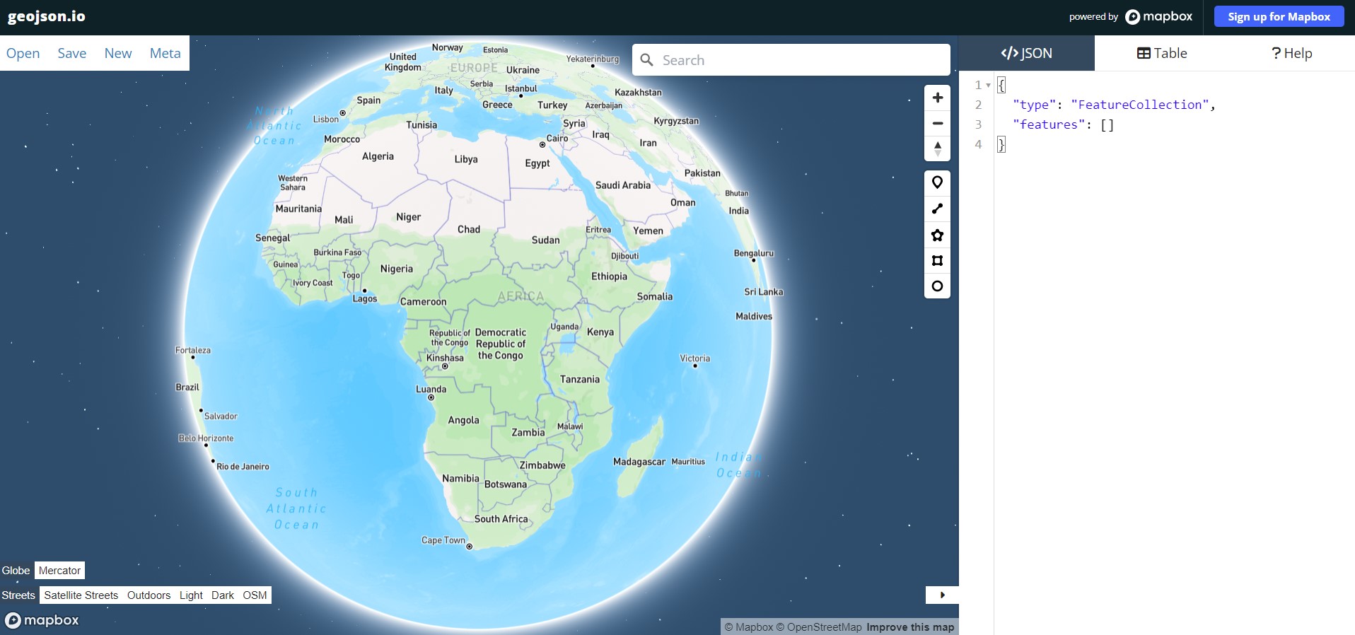 It may look intimidating to create a GeoJSON file without hardly making any errors, and it actually is, but luckily the geojson.io website does the heavy lifting for us. We shall head over to it and create a geojson file of some cities and their population.