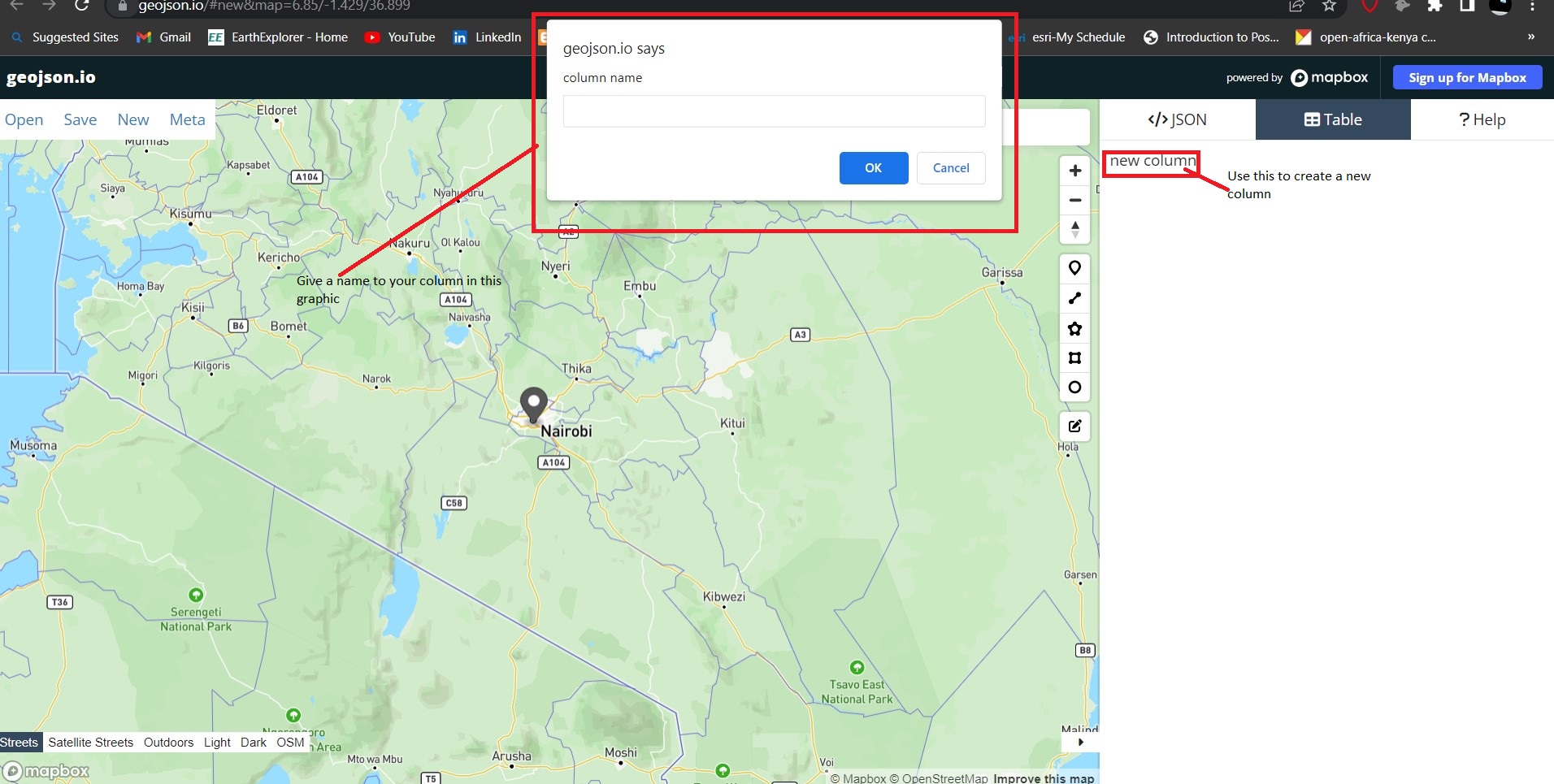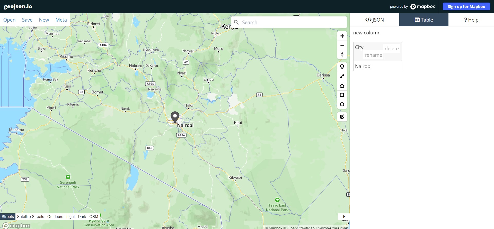 On your right, under the </>JSON tab, the Mapbox folks have already given you a head start by indicating what feature type and features will go into your geojson file. These are important as any website uses these keywords when parsing information from the GeoJSON file. Zoom to Kenya and click a point on top of the Nairobi dot pin, like shown below. Use the highlighted pin in the image below to create a marker over Nairobi.
