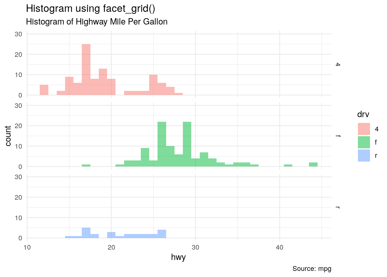 g2 <- g1 + ylim(0,30) + facet_grid(rows = vars(drv)) + labs(title="Histogram using facet_grid()",subtitle = "Histogram of Highway Mile Per Gallon",caption = "Source: mpg") g2
