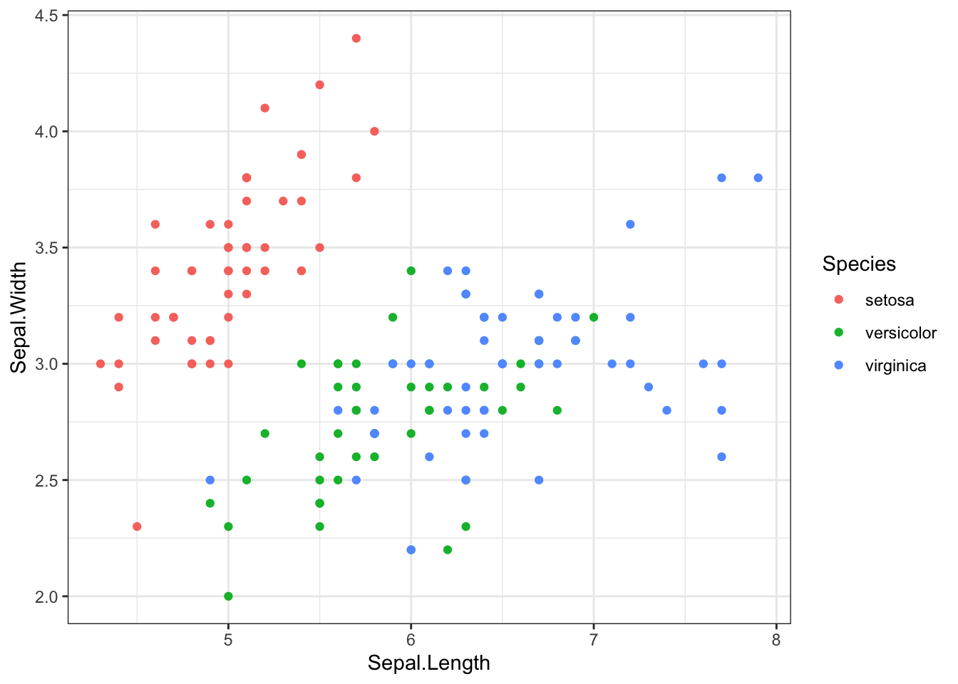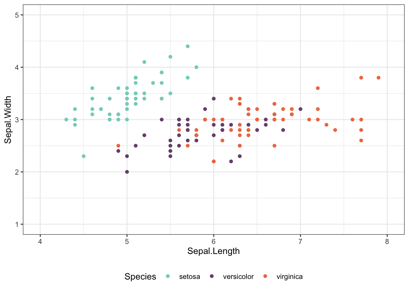 ggplot(iris, aes(x = Sepal.Length, y = Sepal.Width, color = Species)) +
