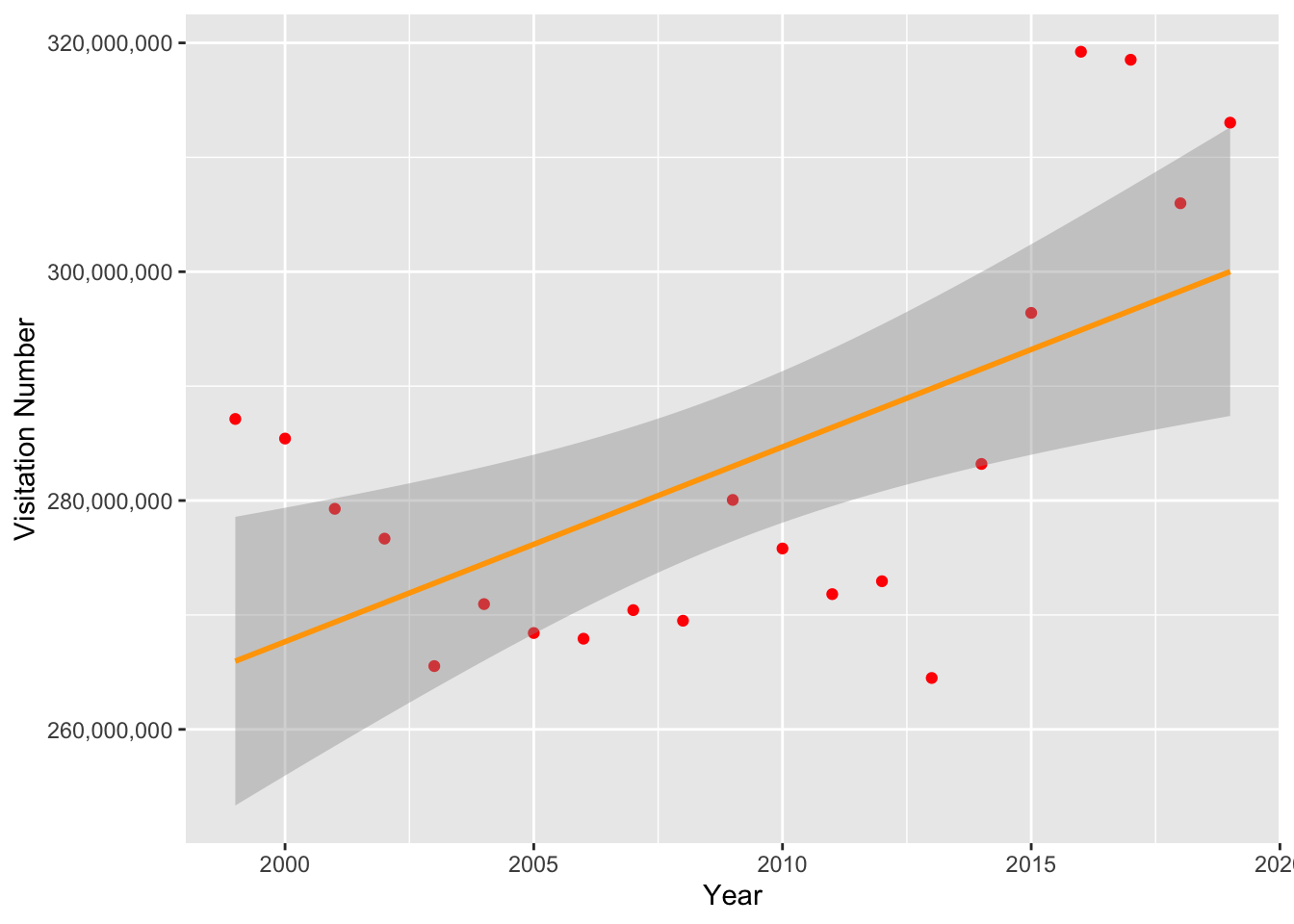 colnames(df)[1] ="Visitation"# Plotting visitation vs. Year