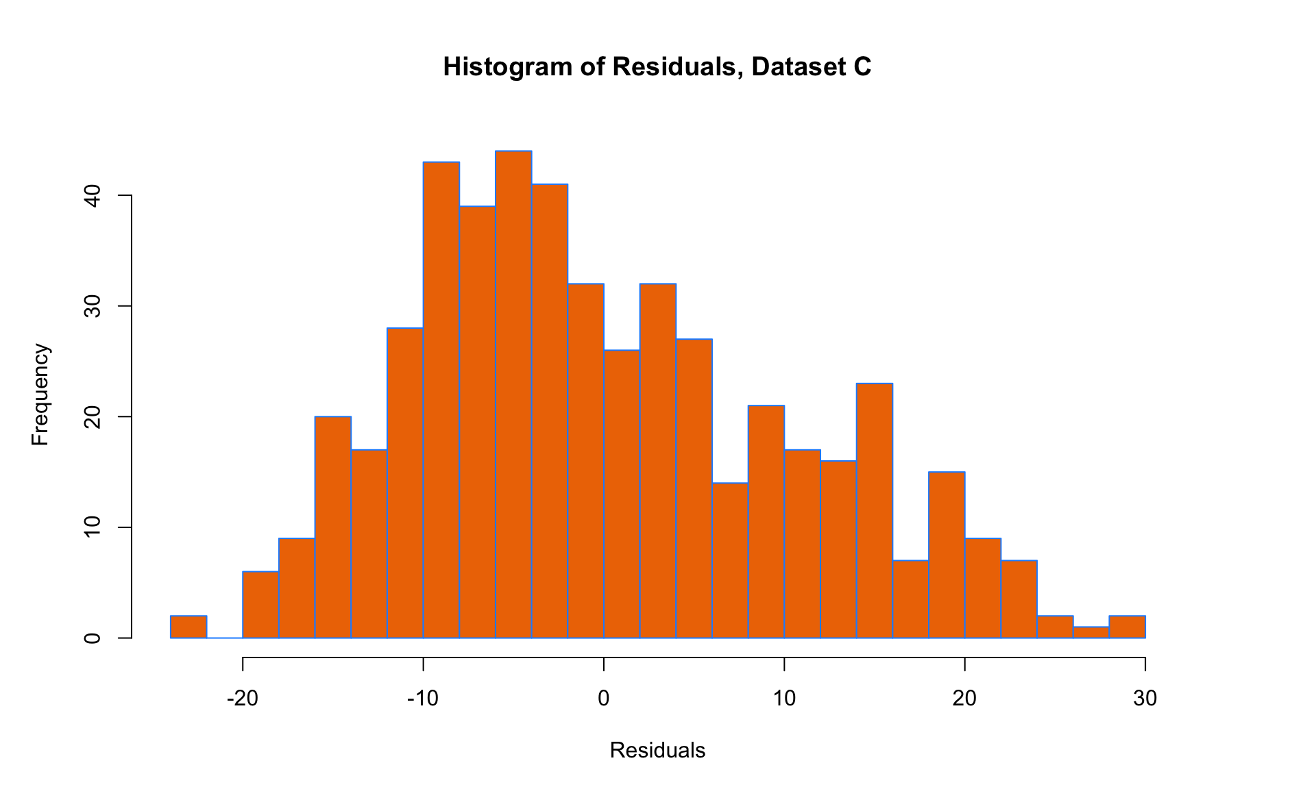 Based on the diagnostic plot criteria outlined above, we can see that conditions L, I and N are mostly satisfied (although, one might argue that the histogram of residuals is not Normal, so this one is a borderline case). In any case, condition E is clearly not satisfied, because the residuals tend to spread out (i.e., have higher variance) for larger values along the x-axis of the scatter plot. So we should be skeptical of the results of a linear regression analysis on this dataset.