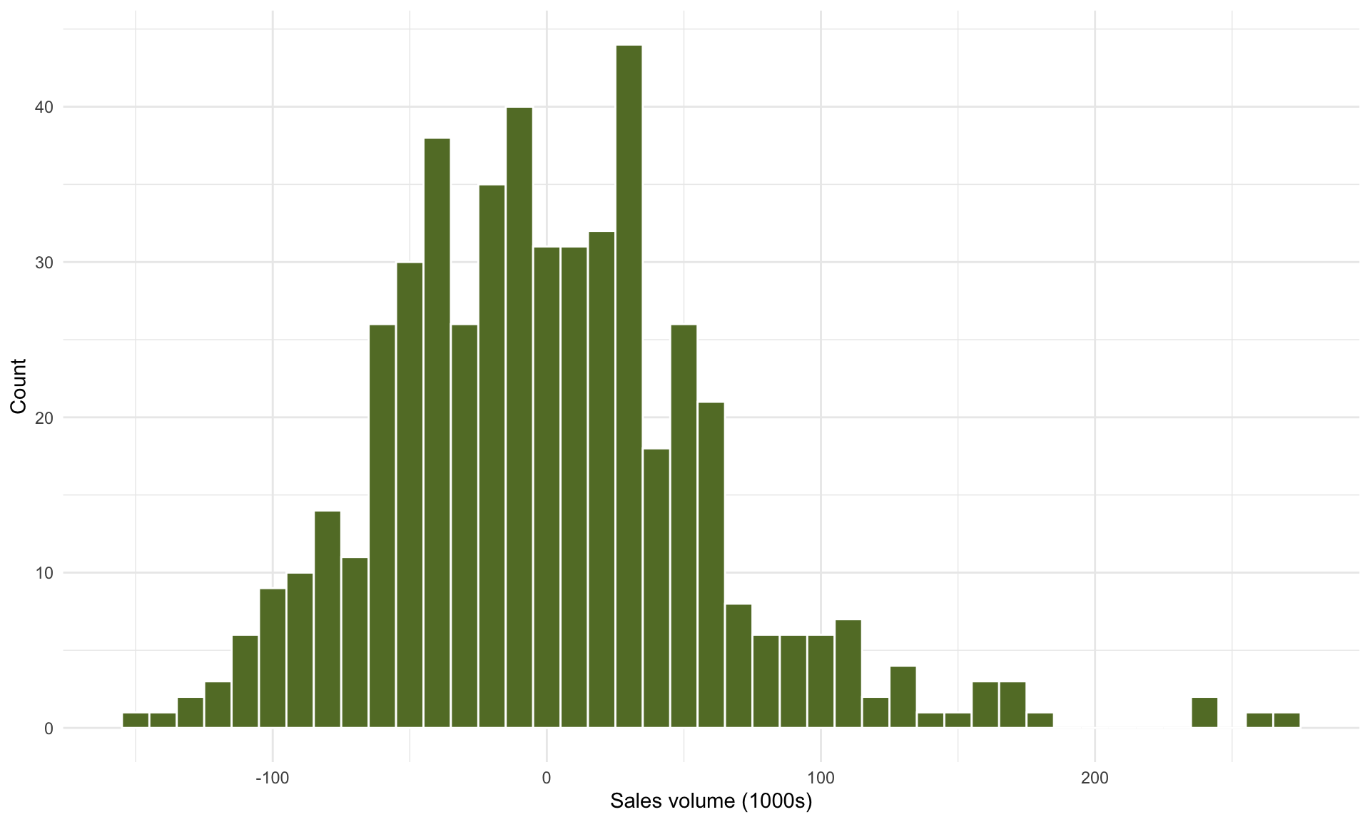 In the line above, volume ~ price + region instructs lm() to build a regression model using both the price and region variables. If we were to omit + region, then lm() would lump all of the data from the three regions together and build one-variable regression model using price only, as we did earlier.