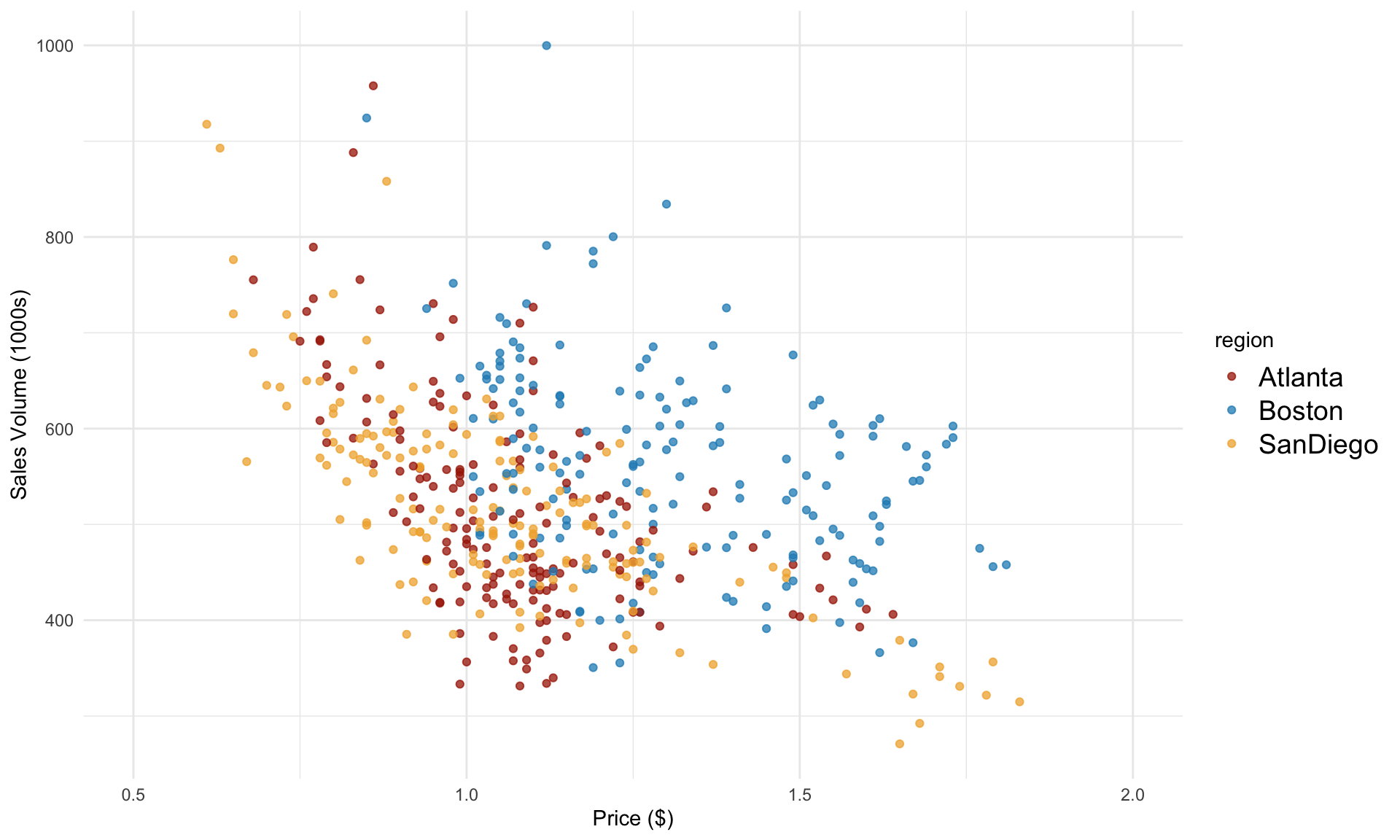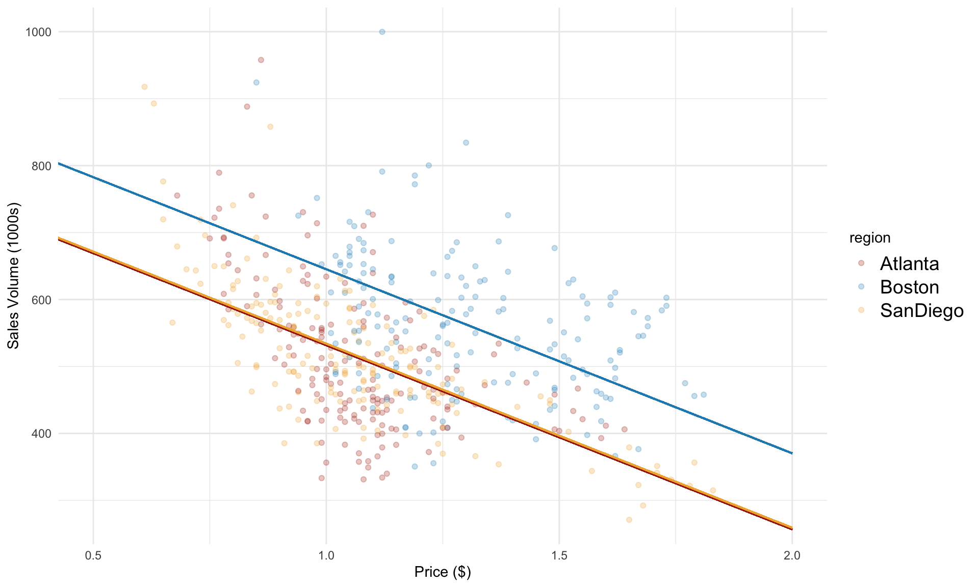 \[ \text{volume} = \beta_0 + \beta_1 \cdot \text{price} + \beta_2 \cdot \text{Boston} + \beta_3 \cdot \text{SanDiego} + \varepsilon \] Note that the regression model above does not include Atlanta as a variable.