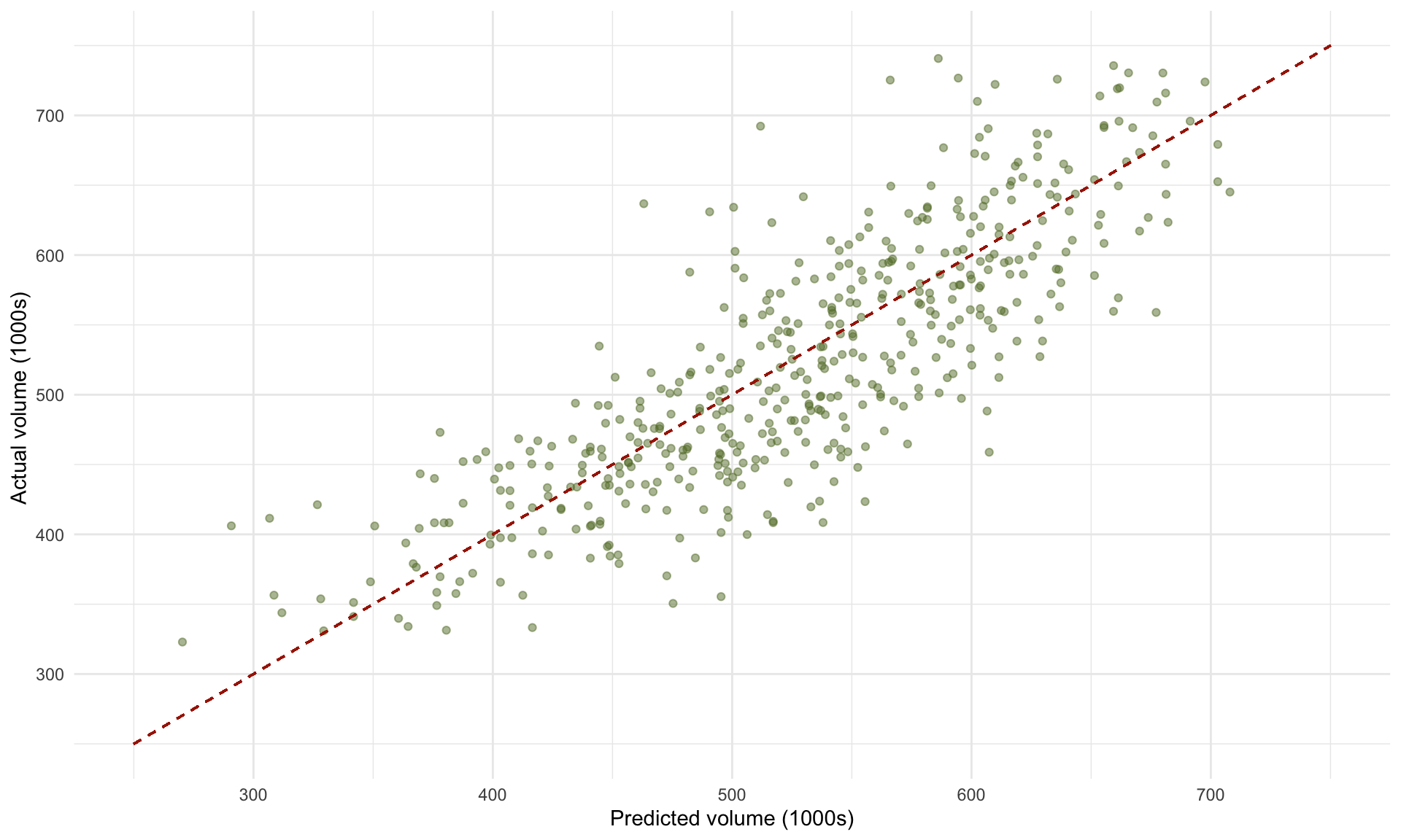 From the model above that includes year and season variables, we obtain the following scatterplot of actual vs. predicted volumes: