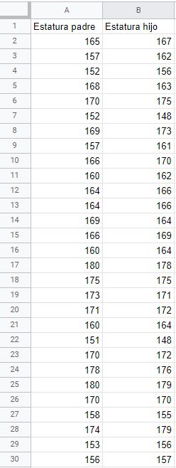 De acuerdo a las preguntas que hicimos, tenemos en una tabla con los datos de las estaturas de padres e hijos, cada fila representa a una familia de las 30 a las que le preguntamos. Aca entramos en un concepto nuevo, las variables, en nuestra tabla cada columna es una variable, ya que los datos que se encuentran en cada una solo y solo pertenecen a las estaturas de los padres y a la de los hijos, no a otra medición.