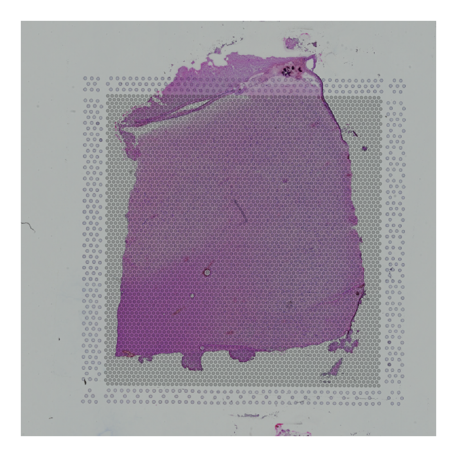 Finally, the SpatialExperiment object also contains the image data from the STx experiment, giving the coordinates we looked at in the previous section some context in terms of the tissue of origin.