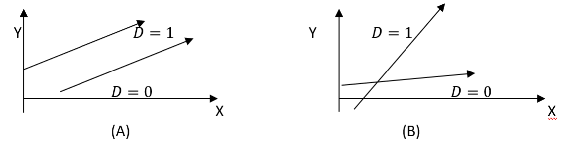 • Model B: \(Y=\beta_0+\beta_1X+\delta D + \gamma X D + \varepsilon\)