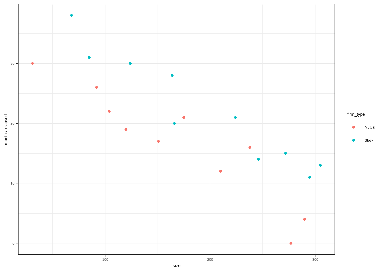 ggplot(insurance, aes(x = size, y = months_elapsed, color = firm_type))+