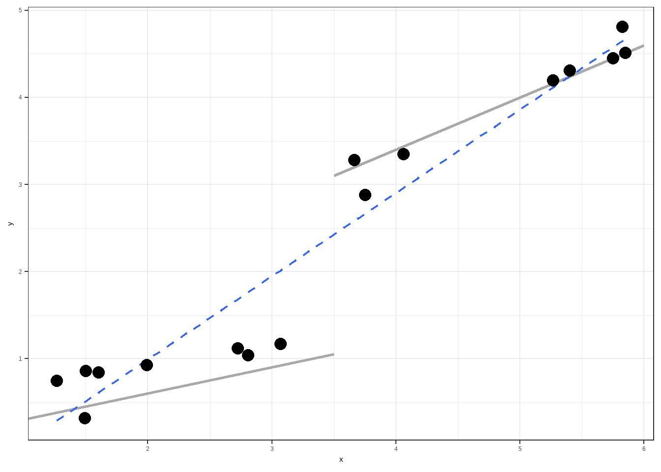 The blue dashed line is the fitted line using whole dataset. However, we can see that the relationship of \(X\) and \(Y\) changes at at some value of \(X=b\). That is, \(Y\) can be seen as a piecewise function of \(X\).