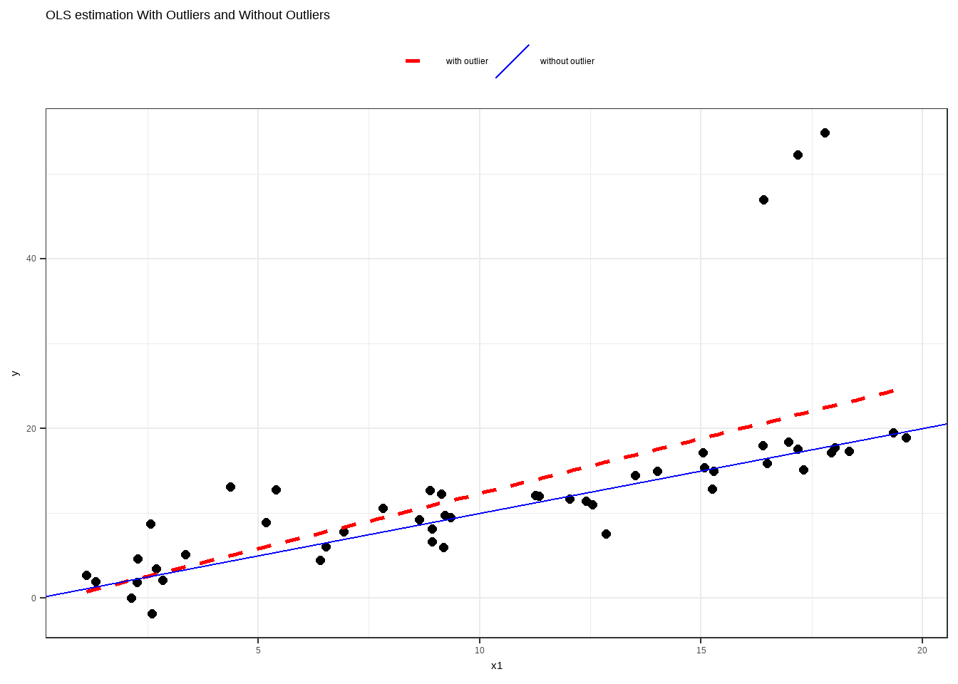 OLS is not resistant to high leverage points, outlying observations and influential observations. Large deviation from the straight line implies minimization of the sum of squares focus on that point only, allowing fewer contributions for more “normal” points.