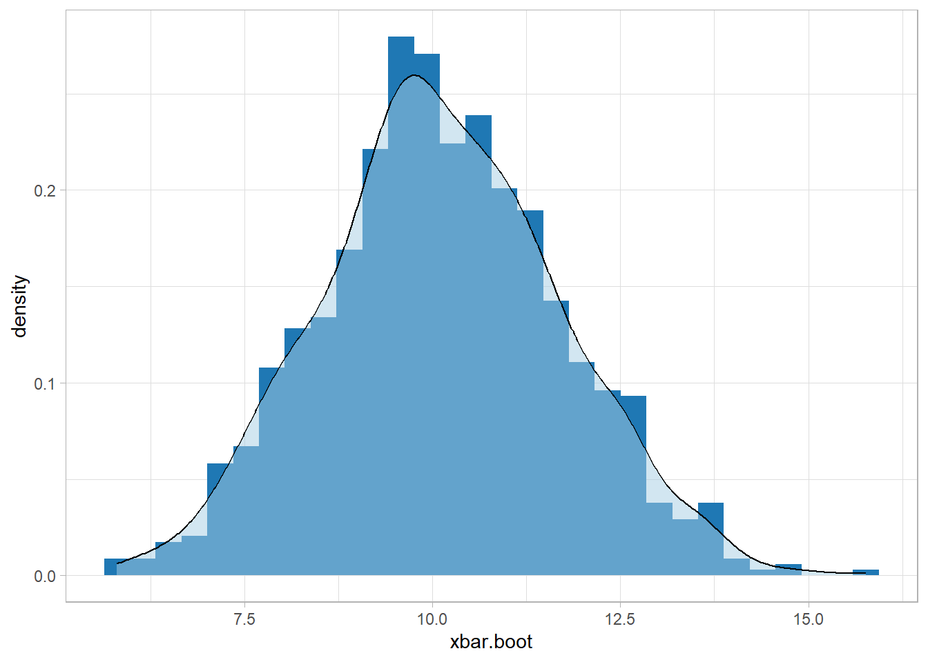 Now that we have the estimated parameters of the negative binomial distribution, we can now have bootstrap estimate of the sampling distribution of the sample mean \(\bar{X}\).