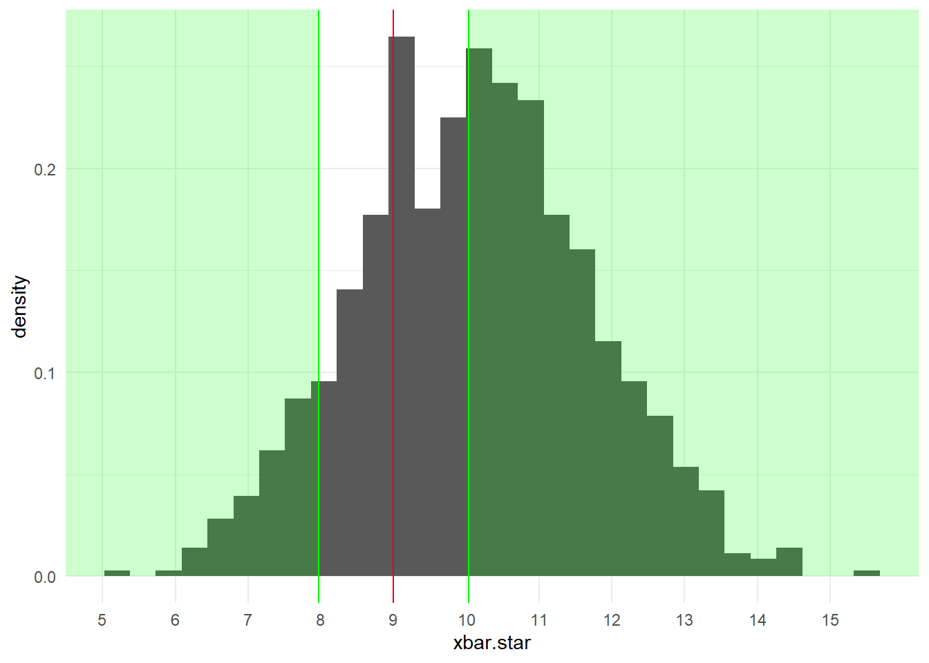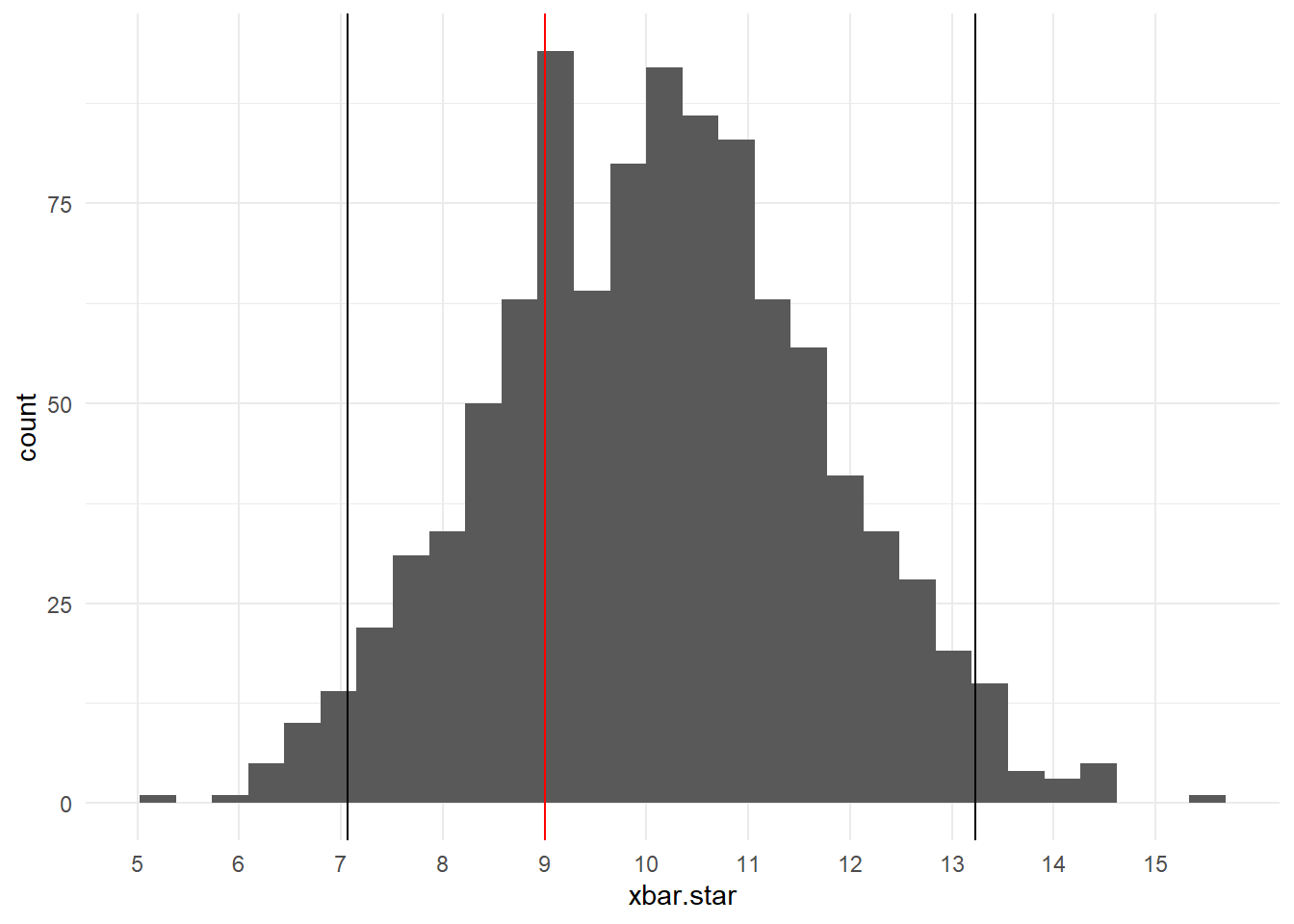 For our example, the observed statistic is \(\bar{X}=10.0333\). From the different values \(\bar{X}_b^*\), we want to find the proportion of bootstrap estimates that are more extreme than the observed \(\bar{X}\):